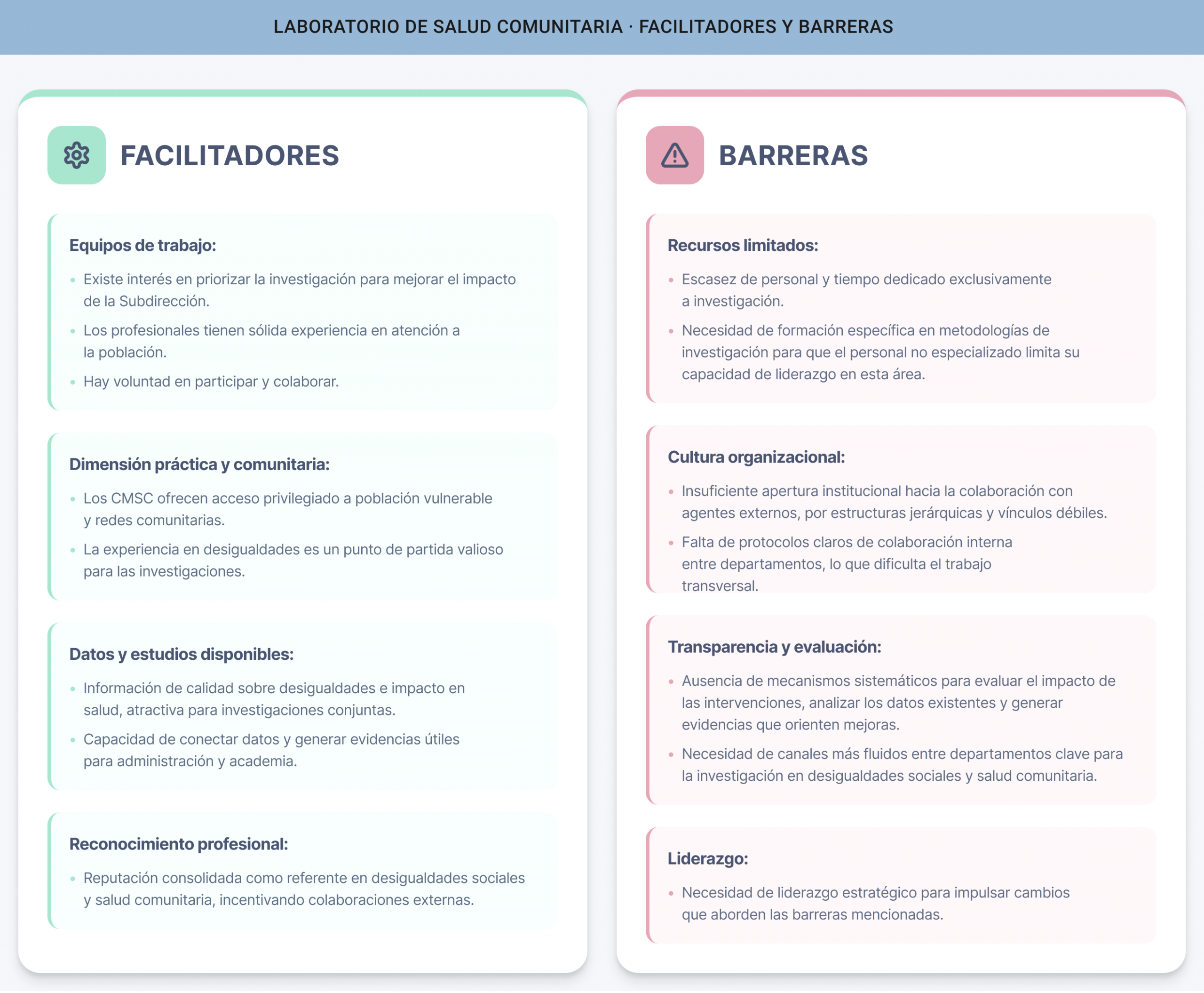 A medida que LABMAD+ se definía mejor, no eran solo sus facilitadores lo que emergía. También aparecieron con más fuerza sus fricciones: necesidad de apoyo de otras subdirecciones y administraciones, impacto organizativo, dependencia de alianzas estables y una estructura de gobernanza mucho más compleja de lo que parecía al inicio.