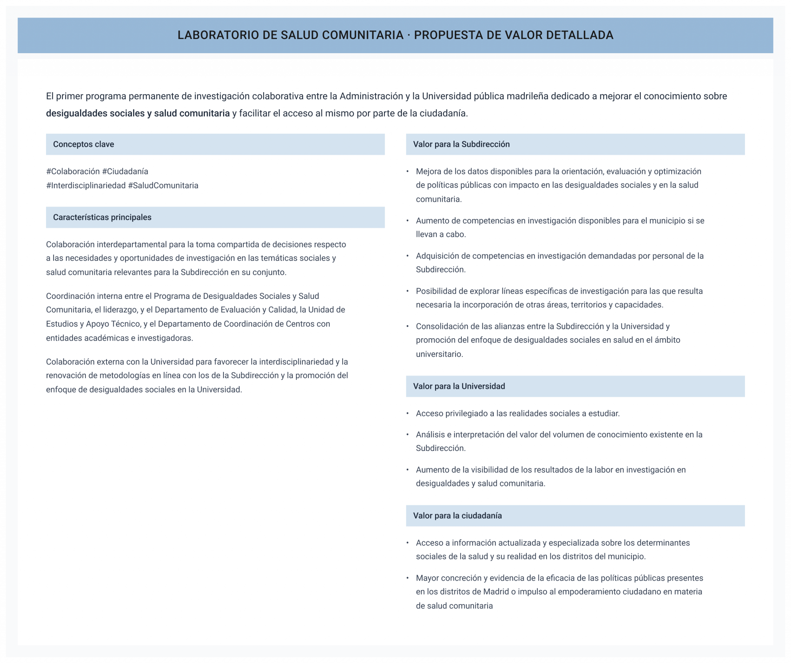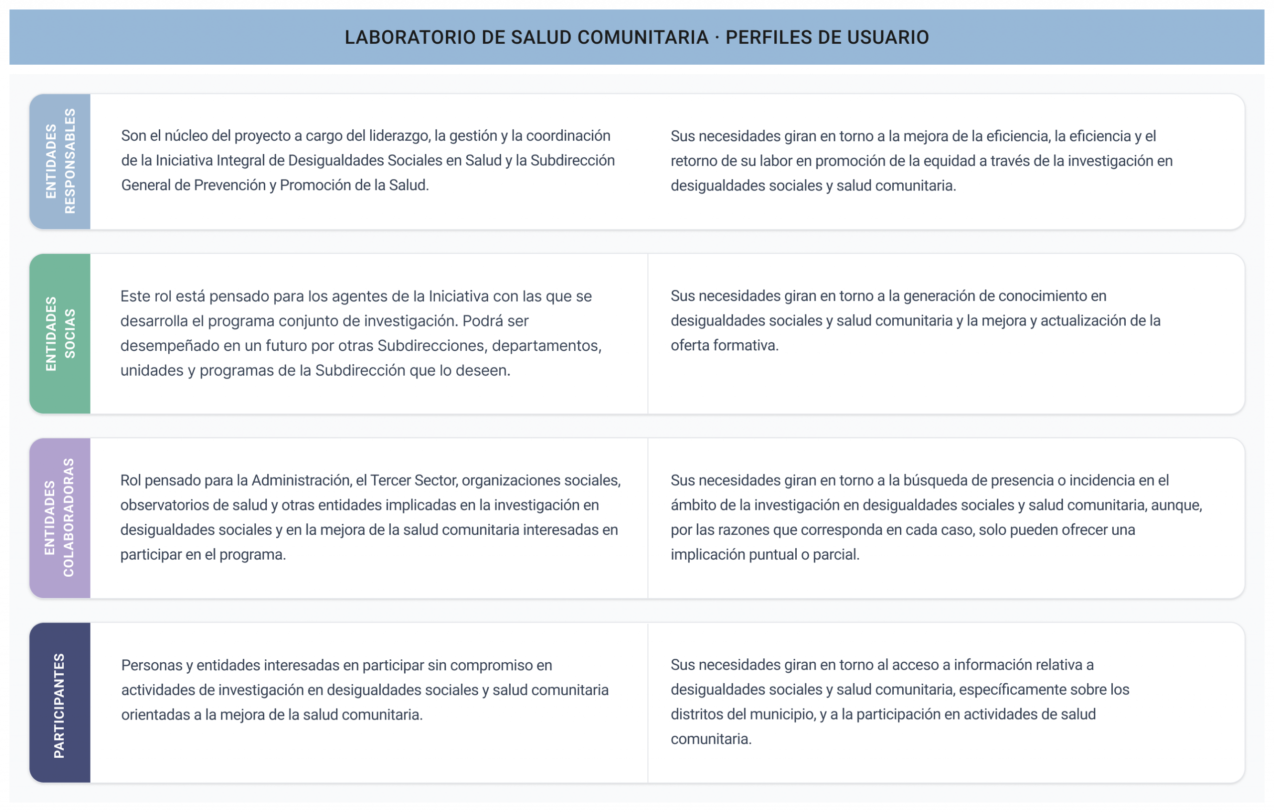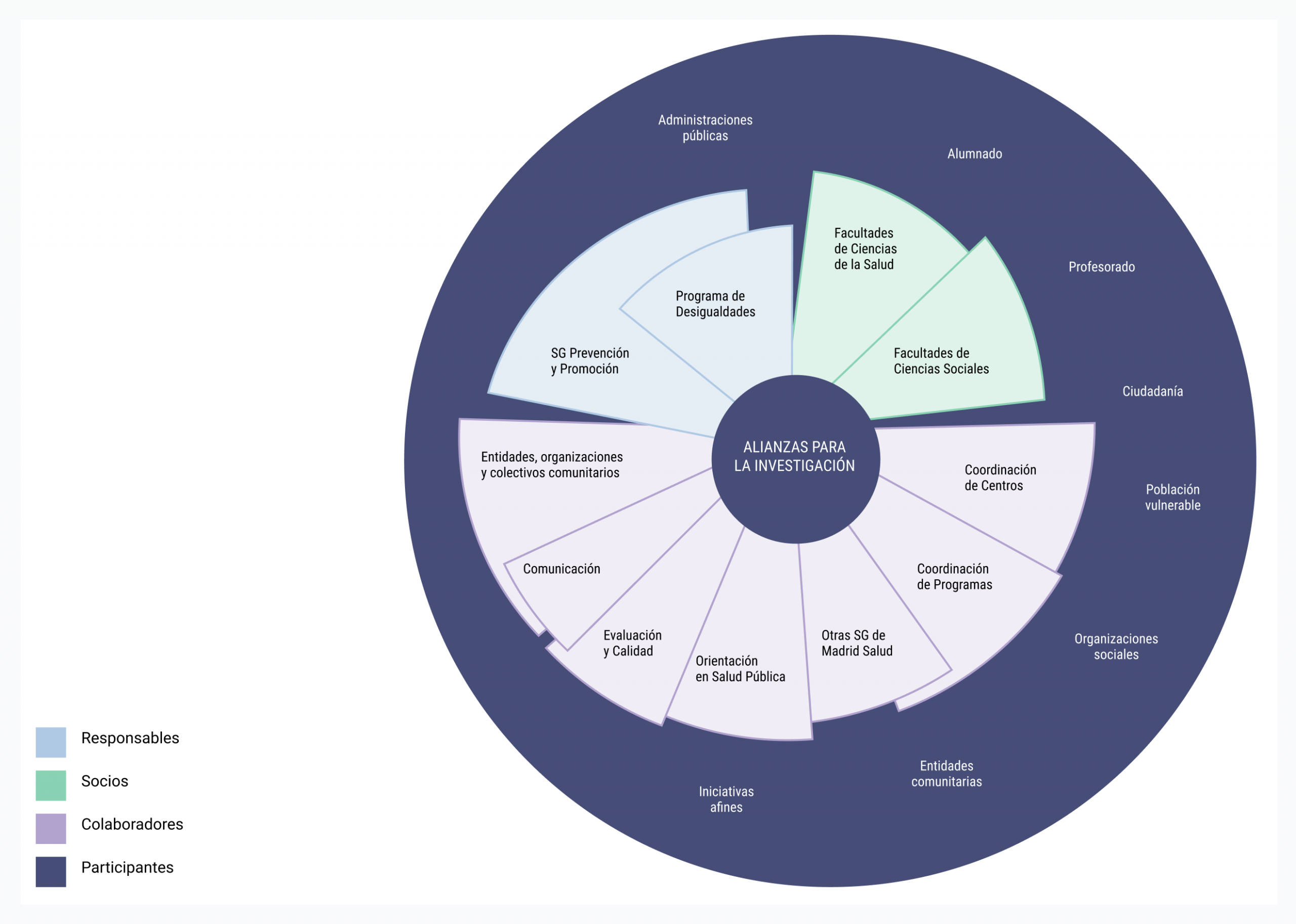 La nueva propuesta ya no se organizó alrededor de una infraestructura expandida de participación general, sino en torno a un programa permanente de investigación colaborativa entre la Administración y la Universidad pública madrileña dedicado a mejorar el conocimiento sobre desigualdades sociales y salud comunitaria y facilitar el acceso al mismo por parte de la población.