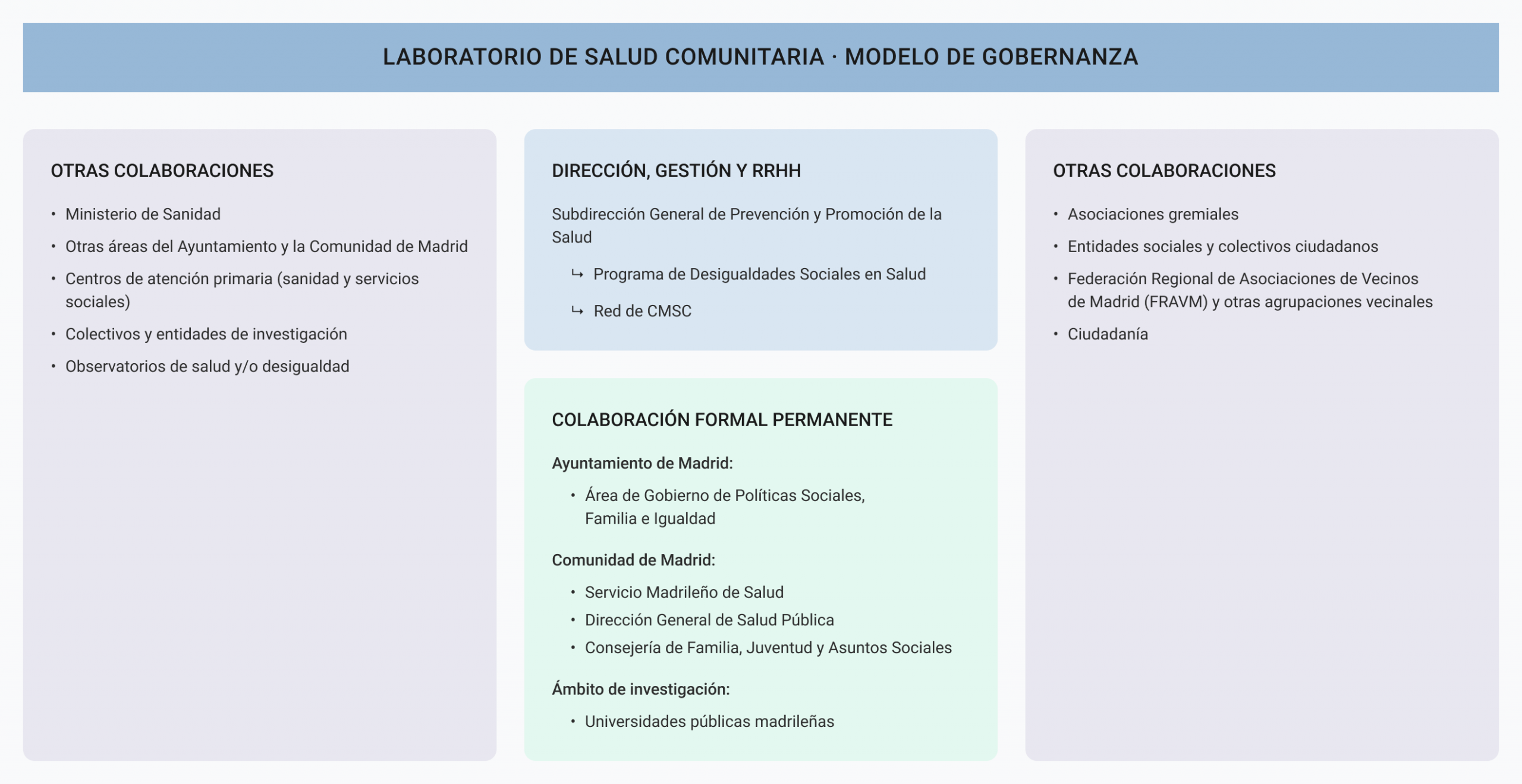 Una vez articulada, la propuesta tomó la forma de LABMAD+: un laboratorio de salud comunitaria orientado a impulsar colaboración entre instituciones, academia, organizaciones sociales y ciudadanía para mejorar la salud comunitaria en Madrid.